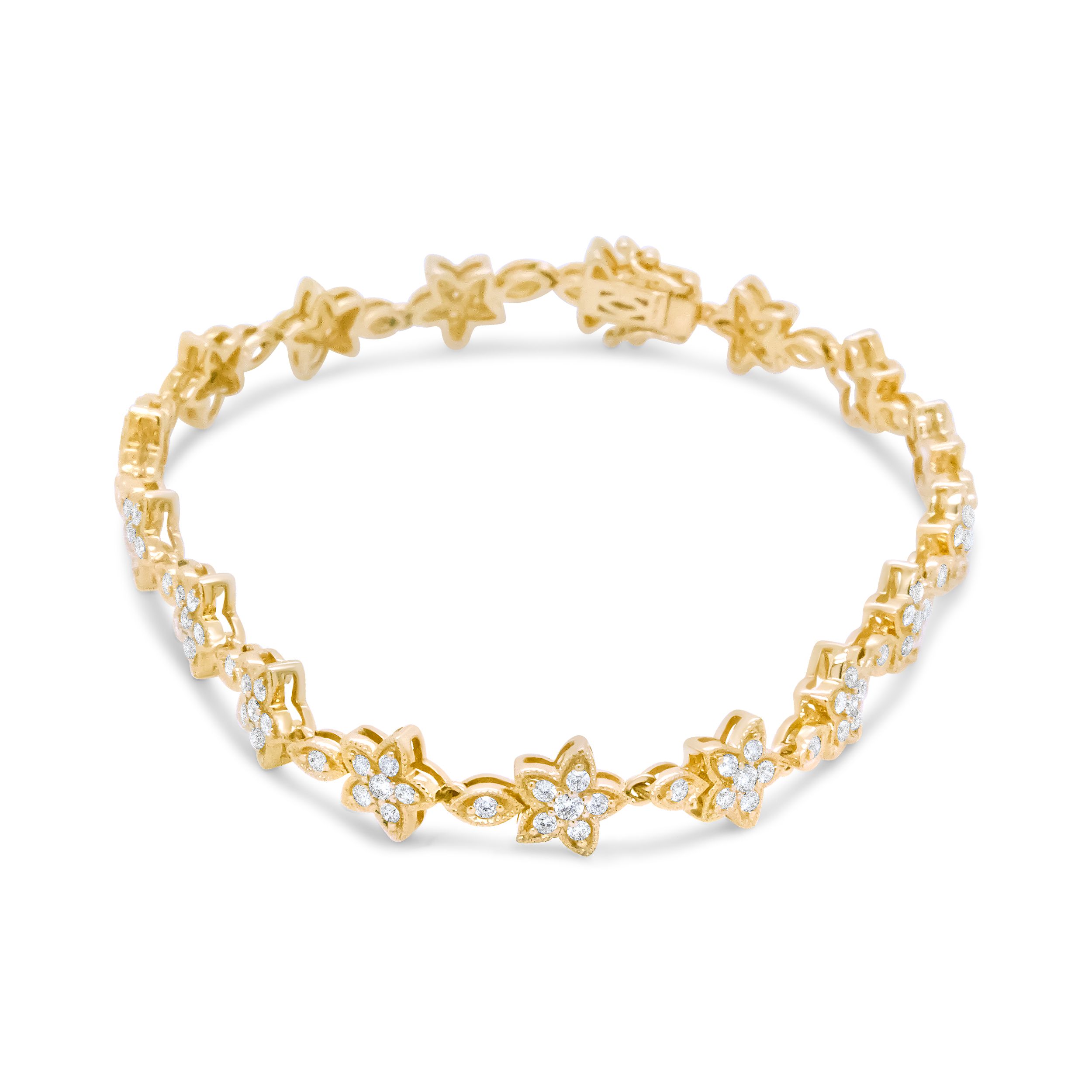 Floral-inspired 14K yellow gold link bracelet Features sparkling Total 1.2 cttw and 119 white diamonds Prong-set diamonds enhance brilliance and elegance Secures with a box clasp for a secure fit Measures 7 inches, ideal for small to medium wrists