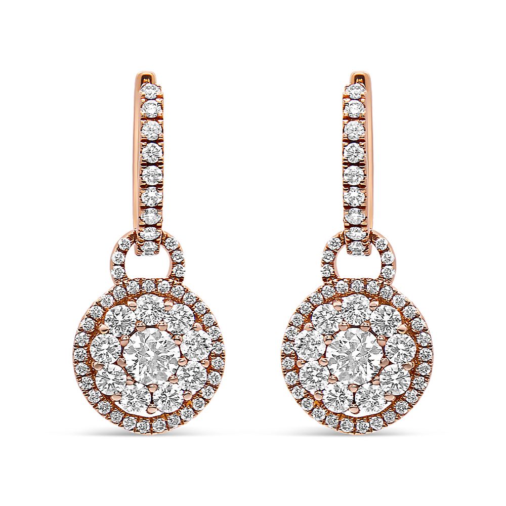 These 18K rose gold drop earrings feature a floral composite of round diamonds, with a 0.225 ct center stone surrounded by nine smaller diamonds. A halo and diamond-studded horseshoe bail add sparkle. Radiant with Total 1.54 cttw and 112 diamonds, they secure with lever backs for an elegant finish.