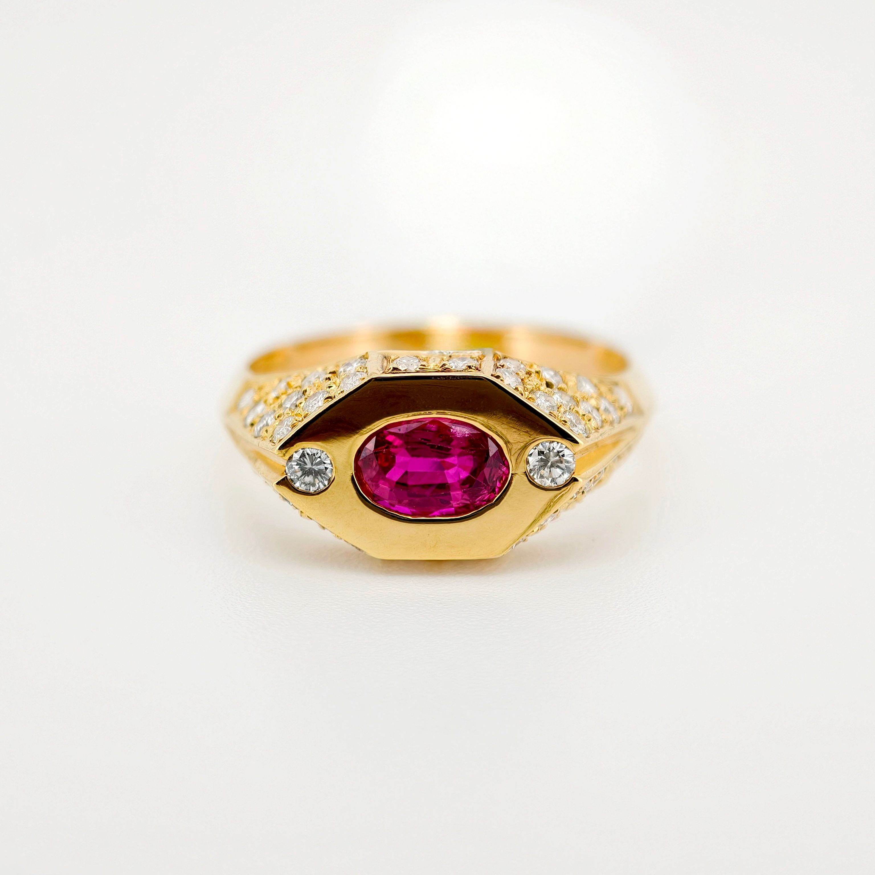 A stunning oval-cut ruby ring, radiating deep red hues that symbolize passion and luxury, set in a refined design.