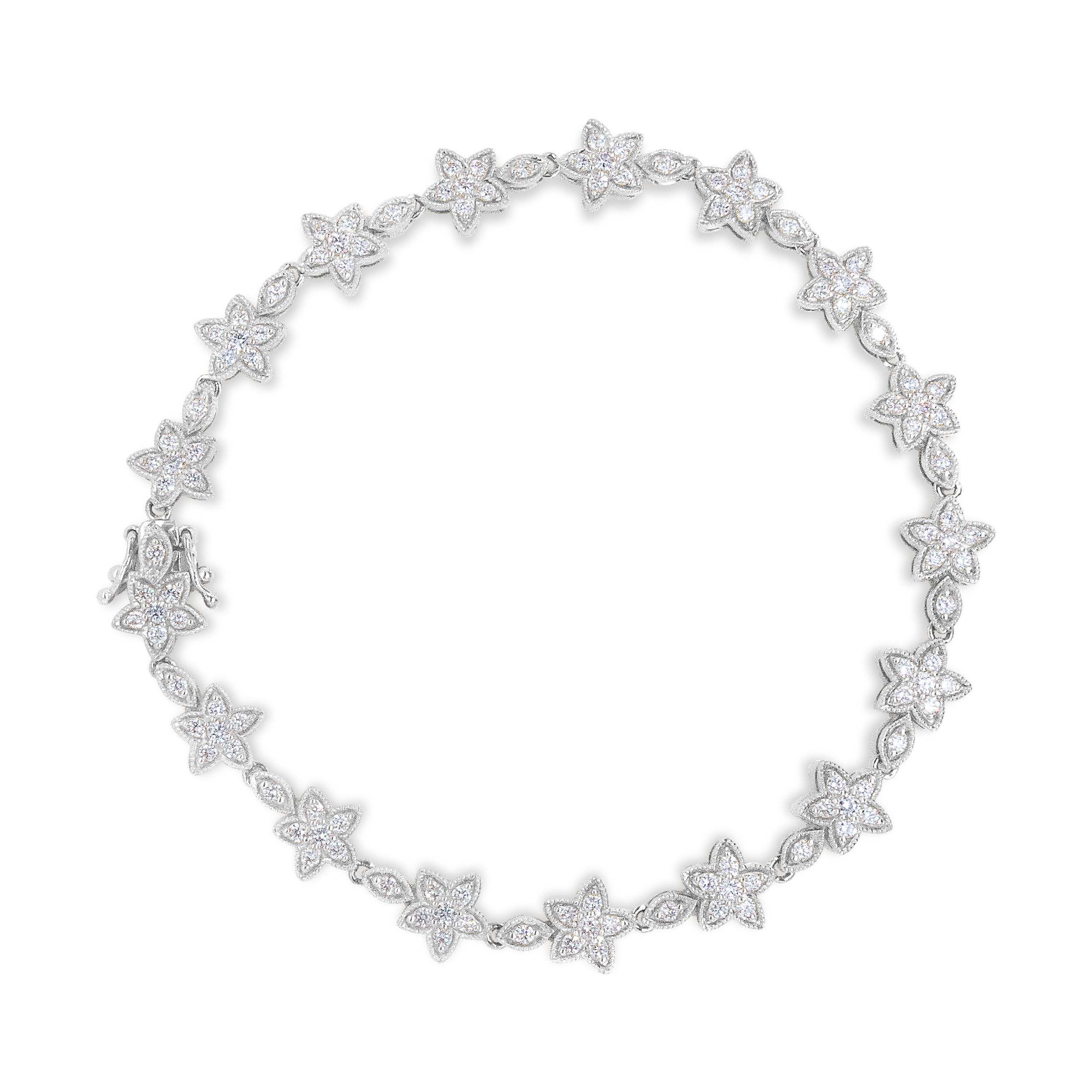 Romantic floral-inspired 14K white gold bracelet Total 1.2 cttw and 119 white diamonds in prong settings Marquise-shaped links add elegant detailing Secures with a box clasp for a secure fit 7 inches long, ideal for small to medium wrists