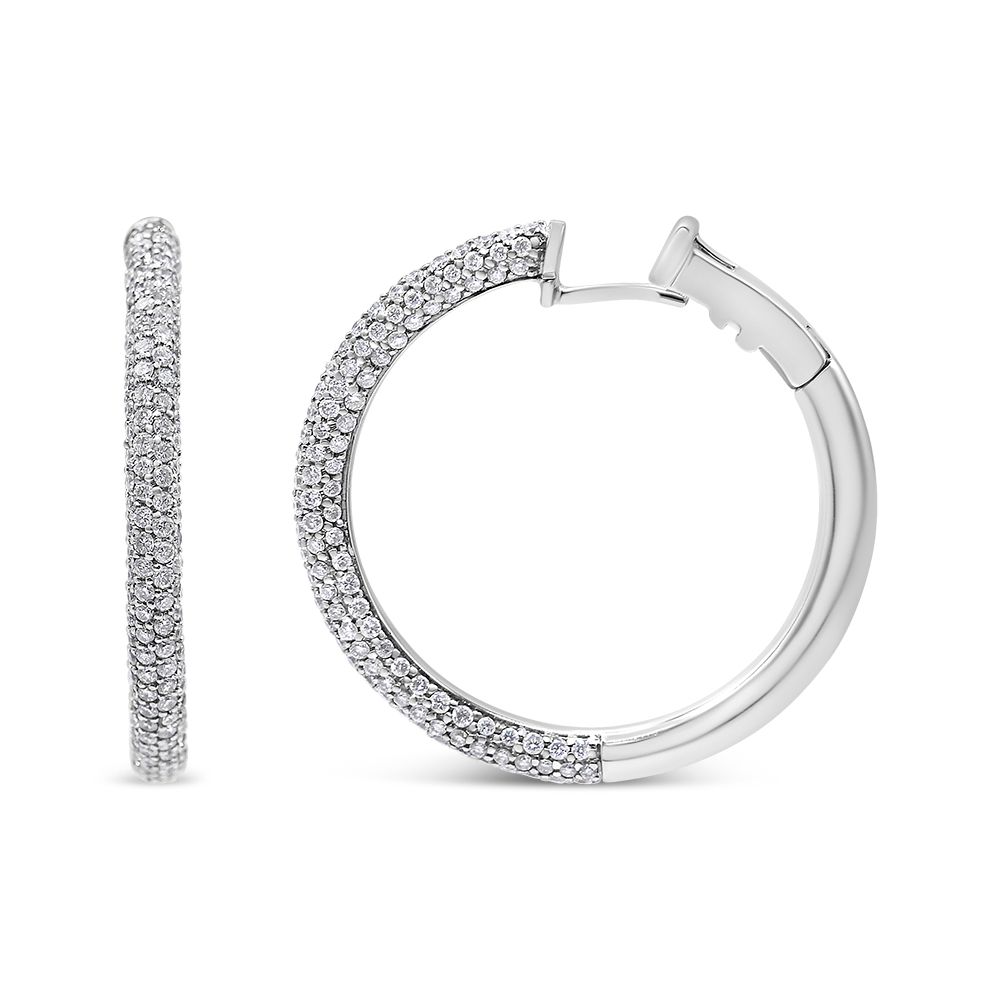 Elegant Design: 18K white gold hoop earrings with a modern touch. Brilliant Sparkle: 400 natural French pavé-set diamonds for 360-degree shine. Impressive Carat Weight: Totaling 2.33 carats for a dazzling effect. Perfect Length: Dangles approximately 1 inch from the earlobe. Secure Fit: Features a lever-back closure for comfort and stability.