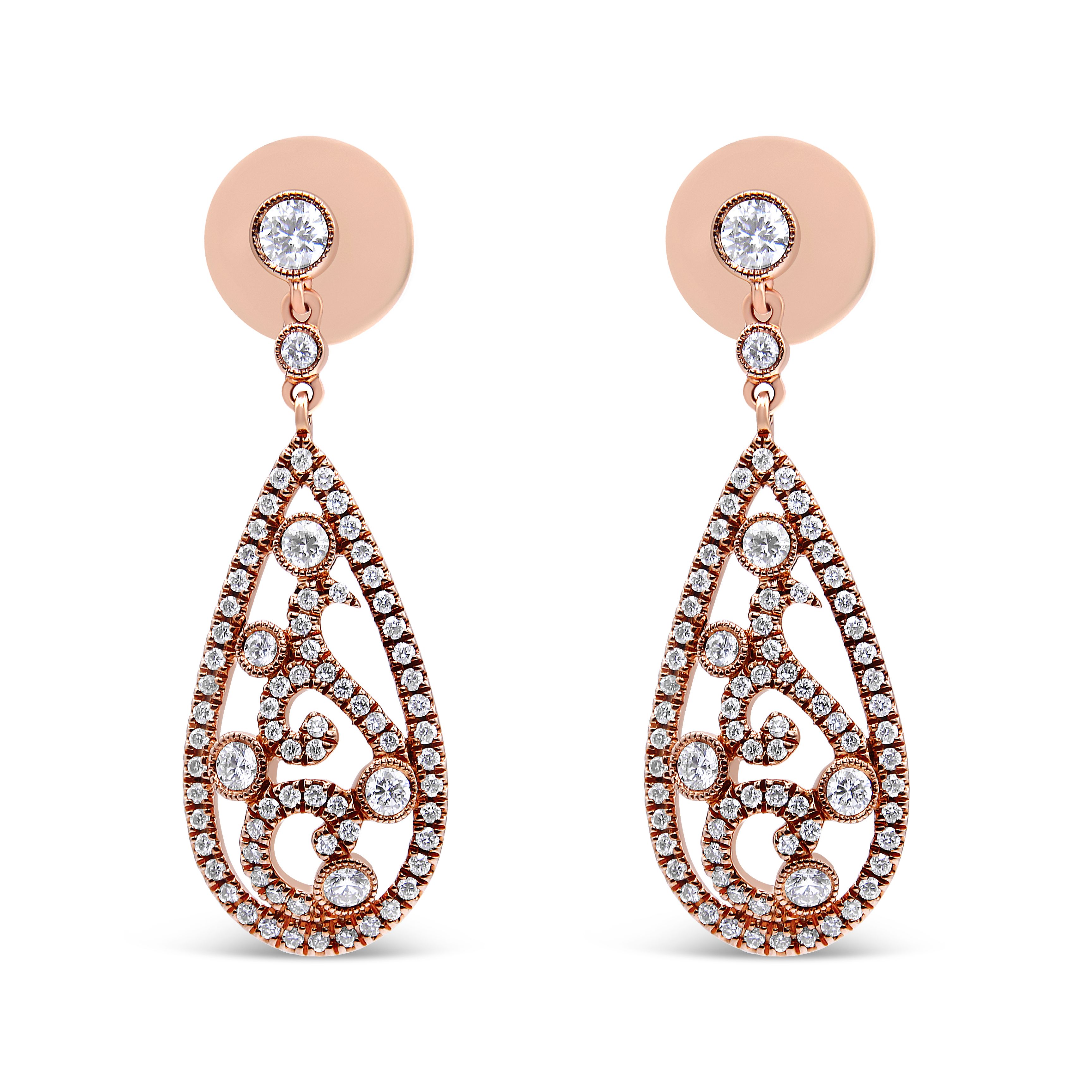 Design: Teardrop-shaped dangles with a diamond-studded spider web Accents: 5 bezel-set diamonds with smaller side stones (total mix 152 Diamonds and 1.19 cttw, VS1-VS2 Clarity, F-G Color) Detail: Milgrain finish for vintage elegance Additional Diamonds: Bezel-set station link & solitaire on the finding Length: 5/8 inches Closure: Secure screw backs Finish: Polished to a bright shine
