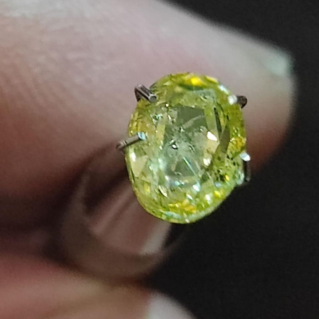• Stone Type: Natural Diamond • Quantity: 1 • Diamond Color: Fancy Greenish Yellow • Diamond Shape: Oval • Diamond Clarity: SI2 • Carat Weight: 1.64 • Diamond Symmetry: Good • Diamond Fluorescence: Faint • Certification: Others