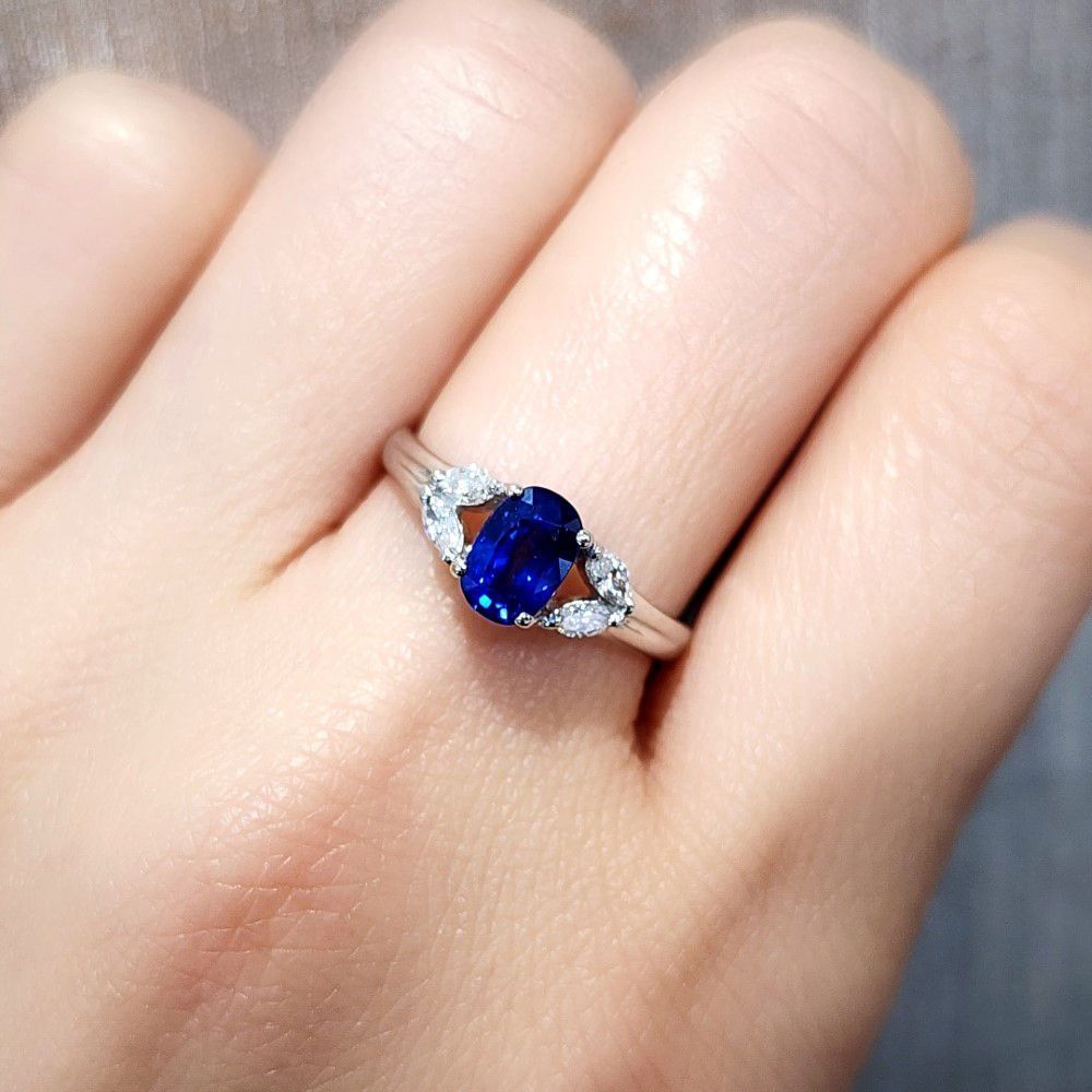 A refined ring featuring a vibrant oval sapphire in a smooth 18K white gold band.