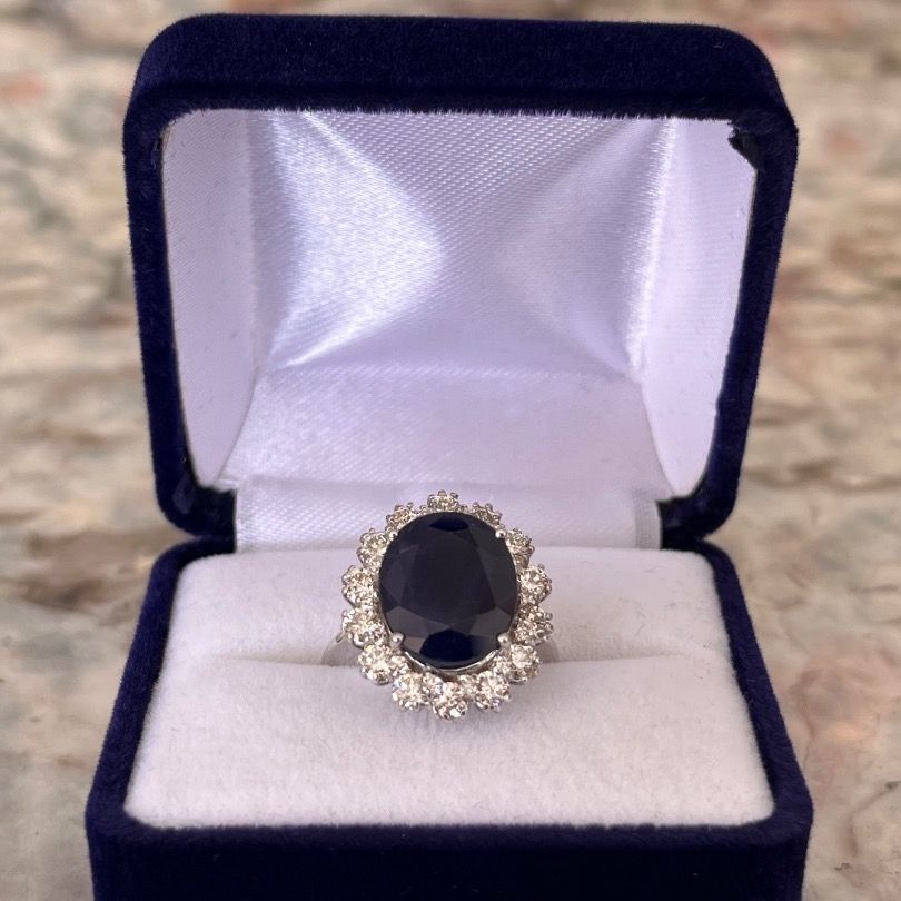 • AIGL Certified Brand New 14K white gold ring • Stone: 6.27 carat oval blue sapphire (non-identical) • Side stones: 28 round diamonds, 1.63 carats total (F-G color, SI clarity) • Diamond cut: excellent, symmetry: very good • Fluorescence: very strong, polish: very good • Ring size: US 6